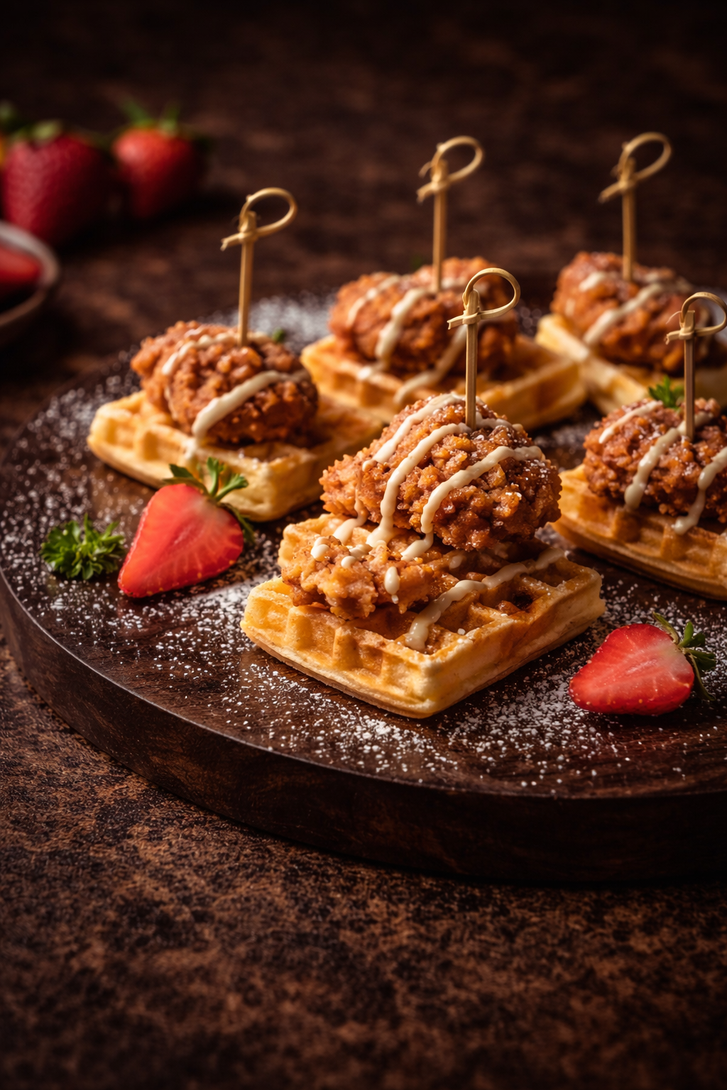 Golden waffles paired with crispy chicken and honey drizzle.