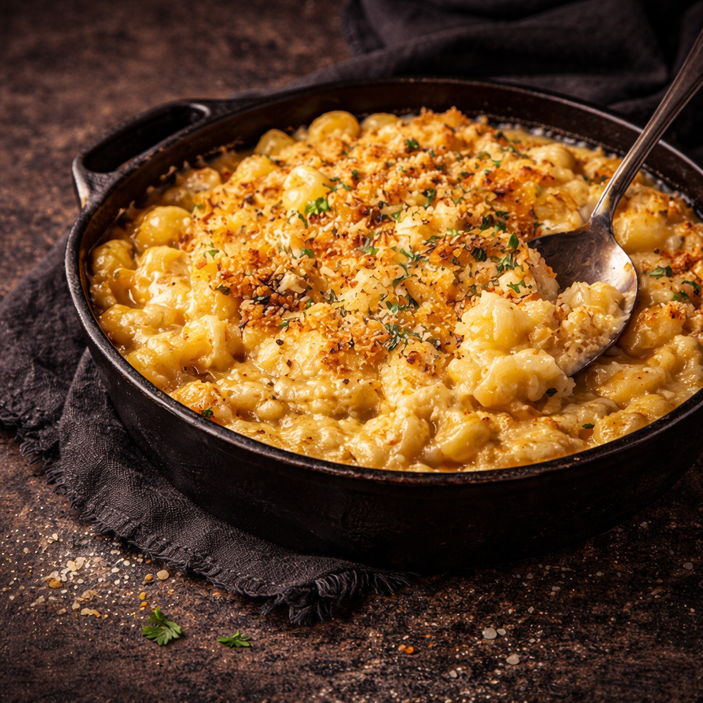 Smoked gouda, sharp cheddar, and mixed cheeses baked to a golden finish.