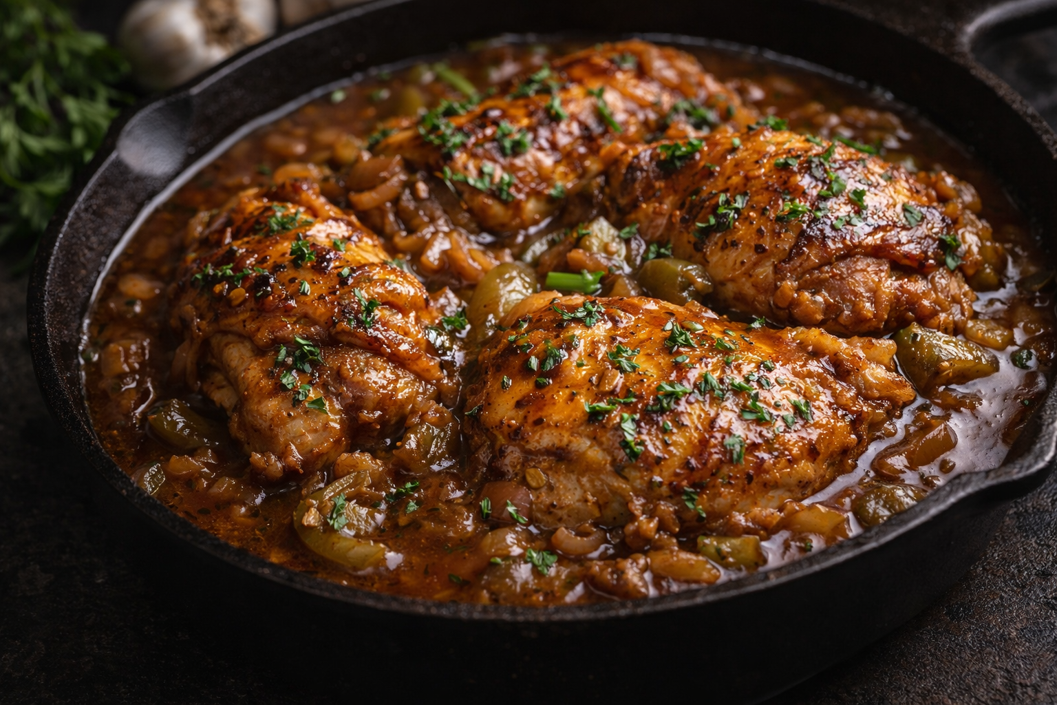 Slow braised chicken in Creole gravy with peppers and onions.