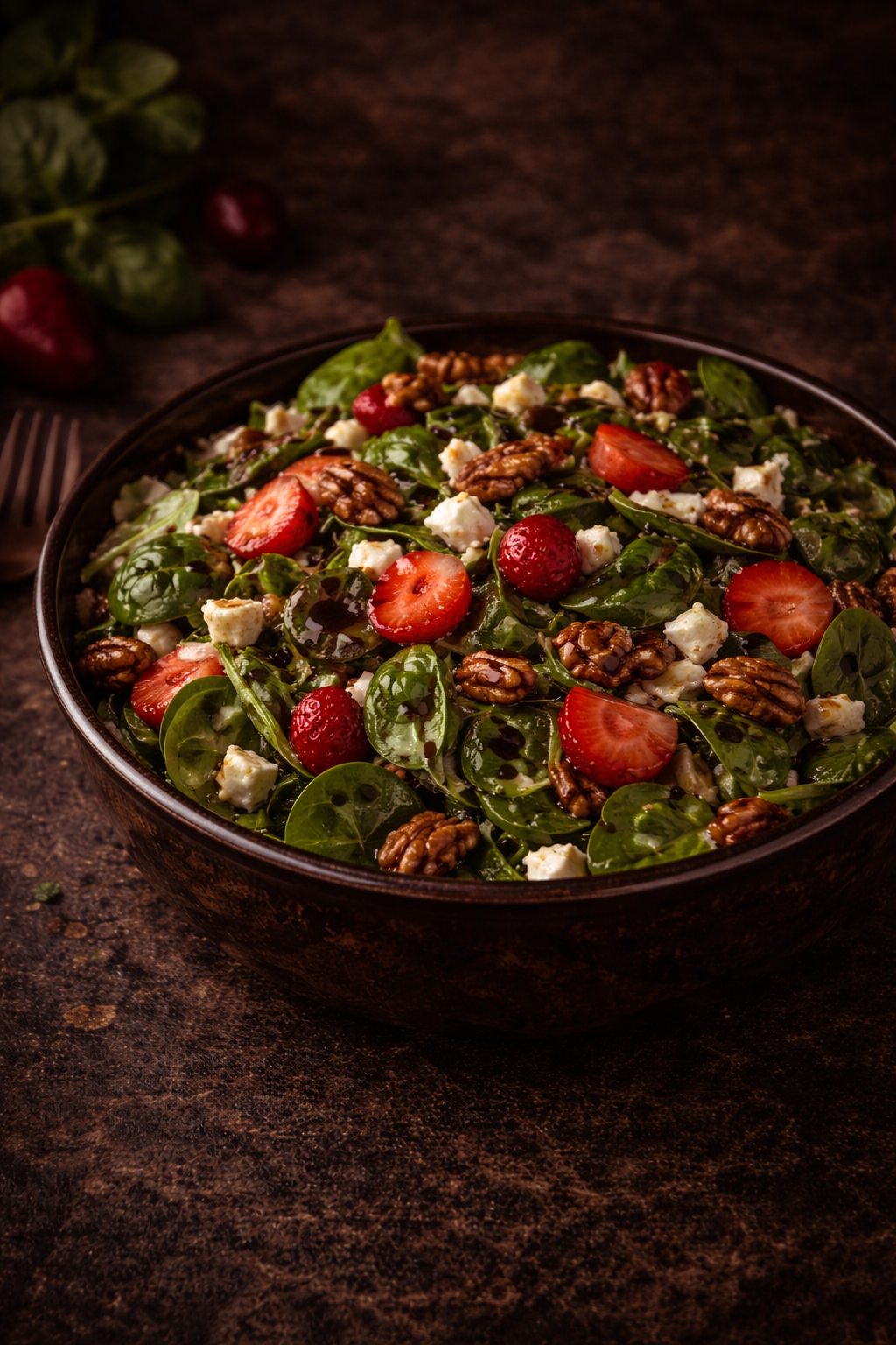 Fresh spinach, strawberries, and candied accents.
