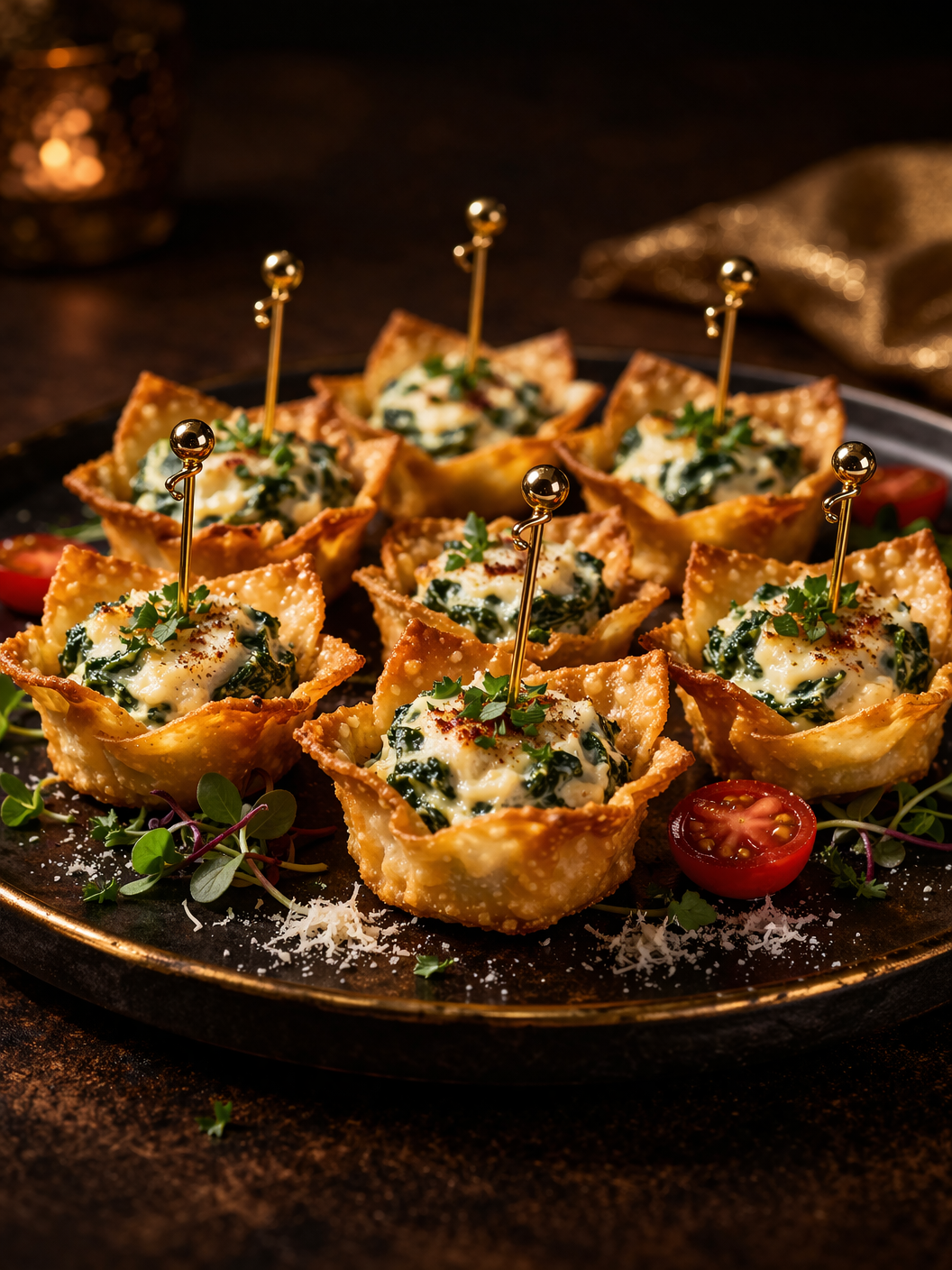 Crispy wontons filled with creamy spinach blend.