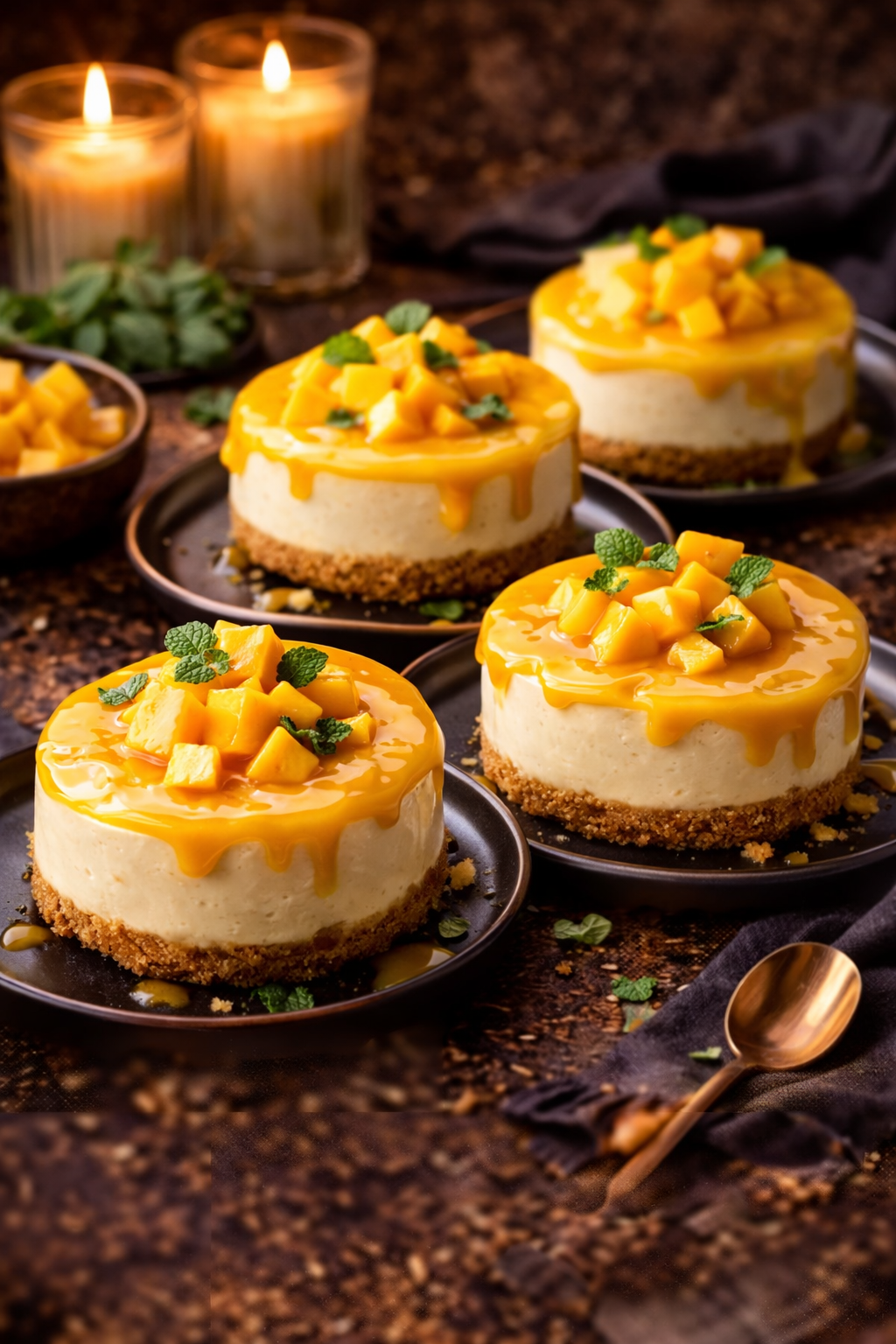 Creamy cheesecake topped with a vibrant mango glaze for a tropical, refreshing finish.