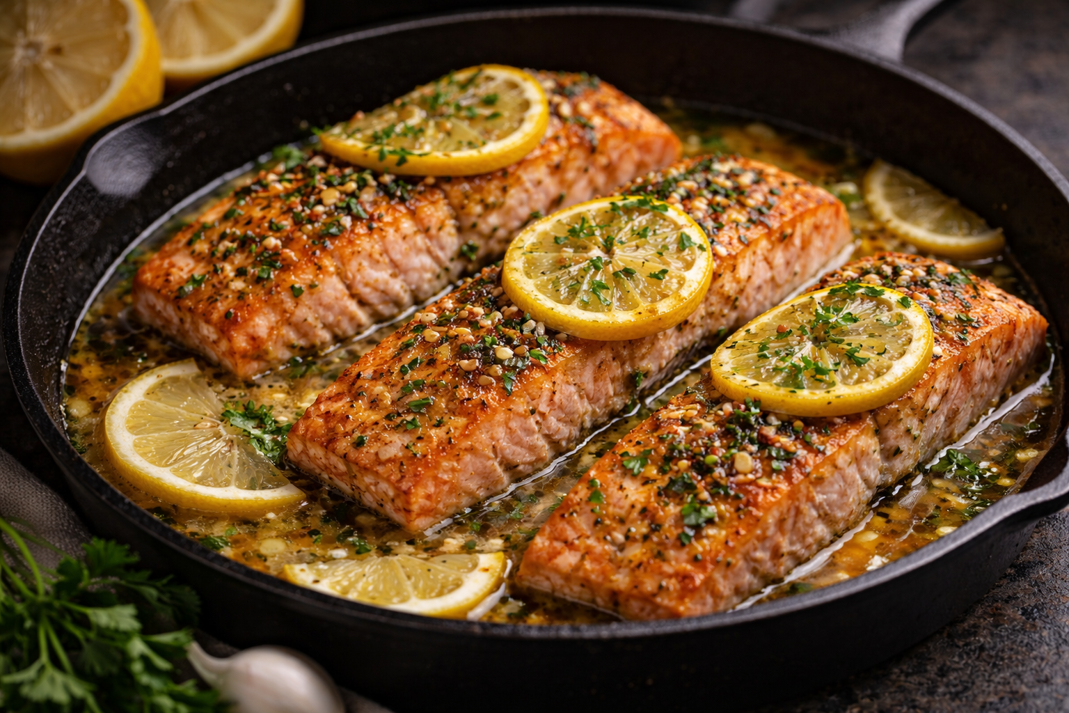 Oven roasted salmon infused with fresh lemon, garlic, and herbs for a light yet flavorful finish.