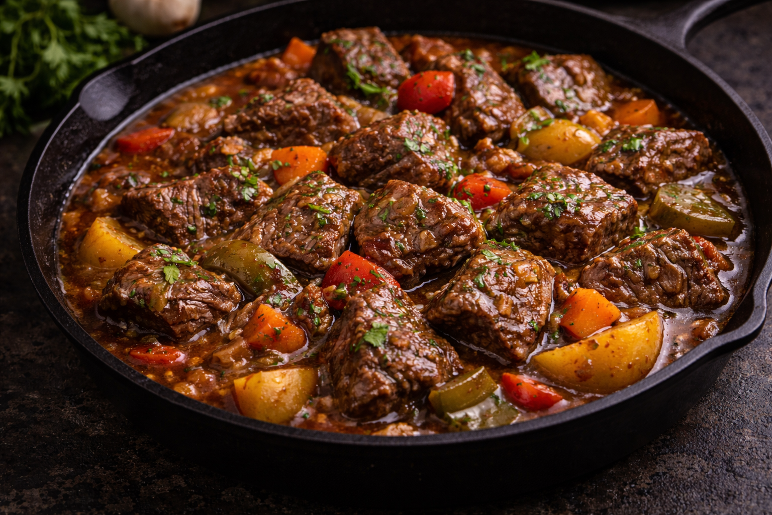 Juicy steak bites sauteed in buttery Cajun garlic sauce with aromatic herbs